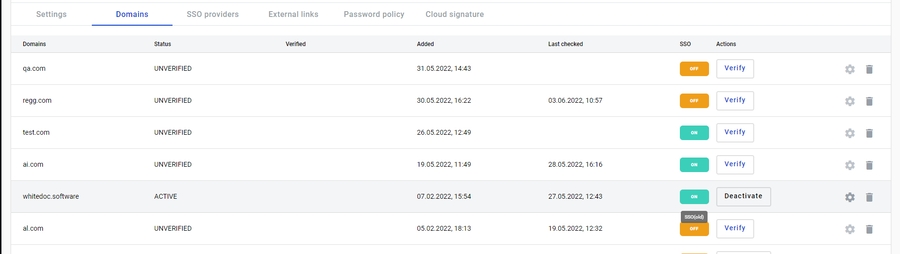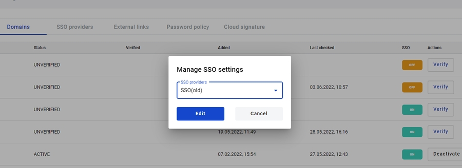 Go to the domains page, select the active domain, and click on the ‘Manage SSO settings’ icon.