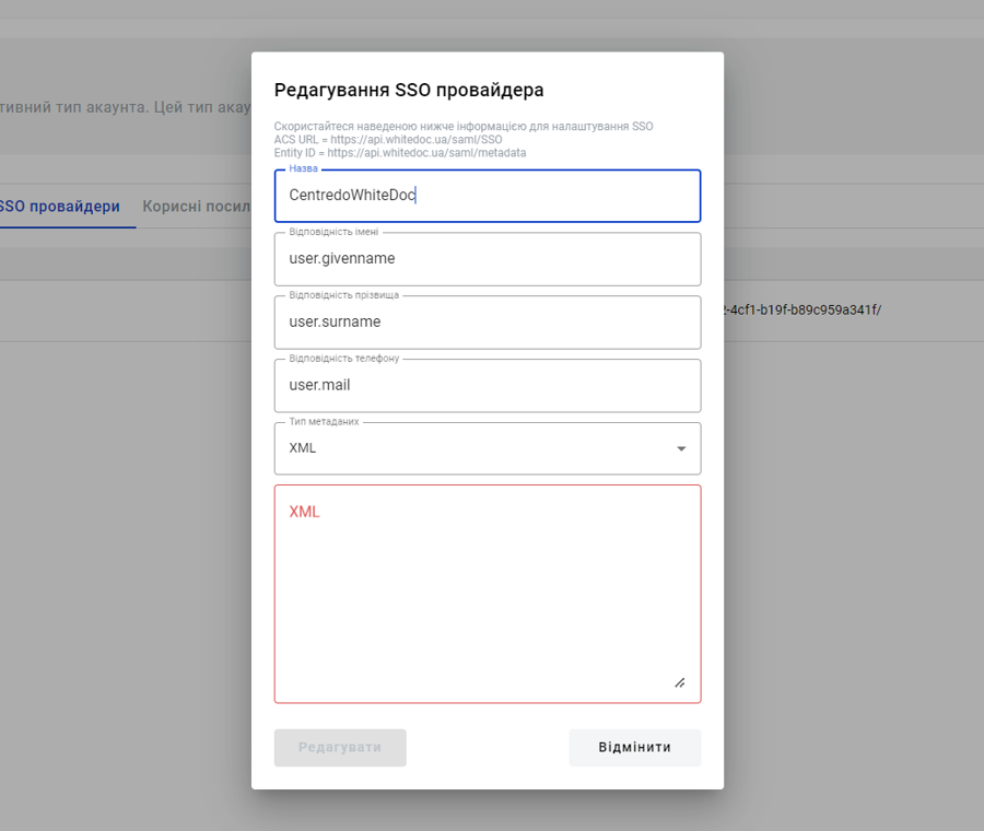 Identifier (Entity ID) = https://api.whitedoc.ua/saml/metadata