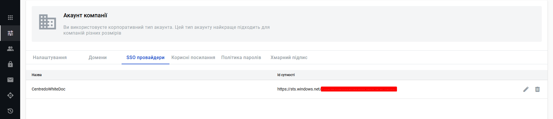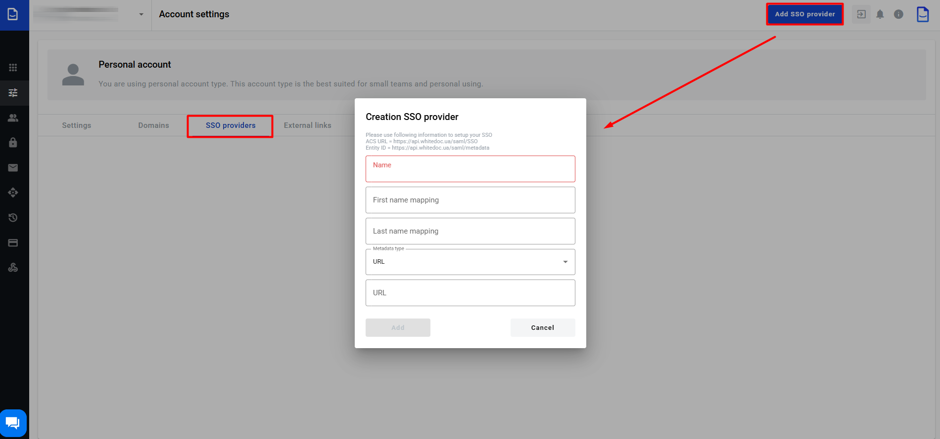 In the 'SSO providers' tab, you can add your SSO providers to set up SSO authentication for corporate users. To 'Create an SSO provider', click on the corresponding button and complete the fields in the modal window: