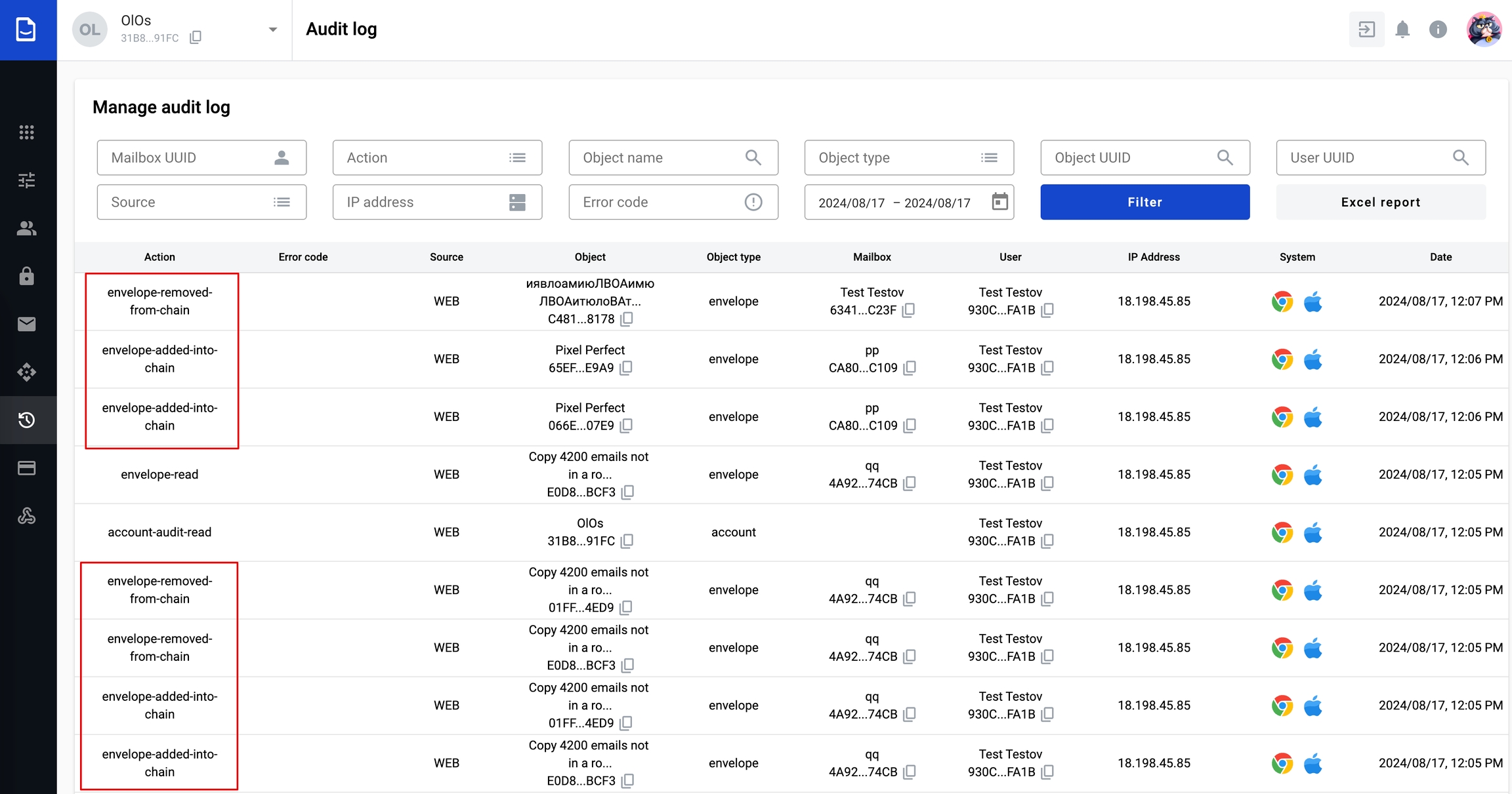 When an envelope is added to or removed from a chain of envelopes, the following actions are logged in the audit log: