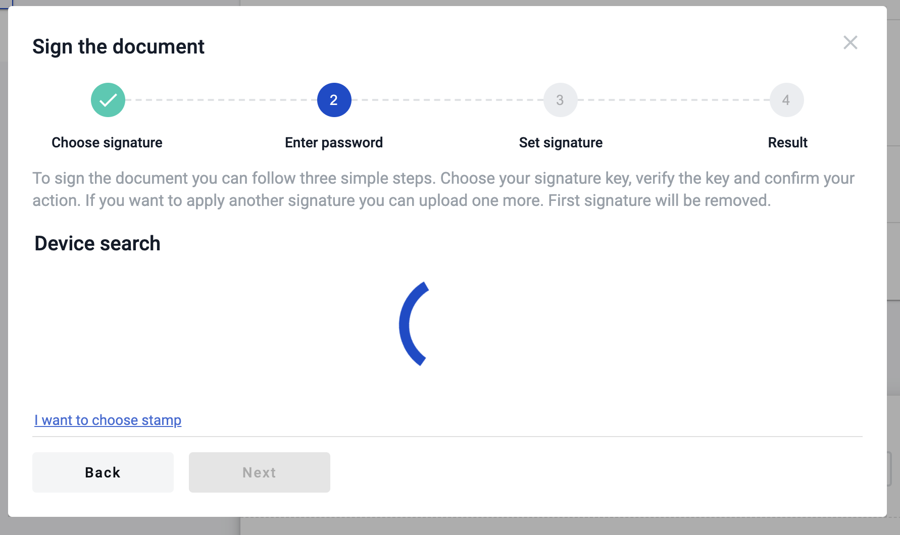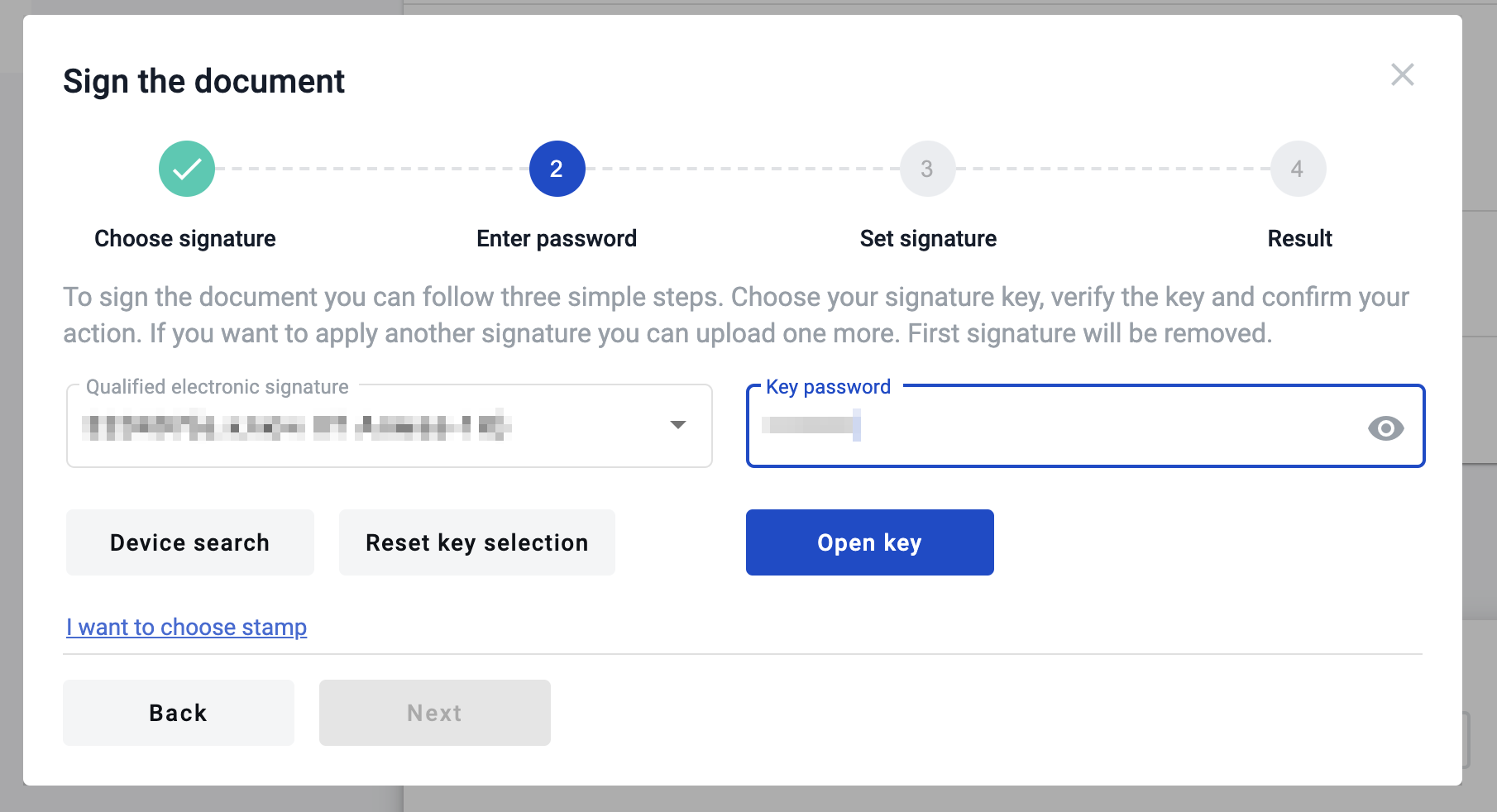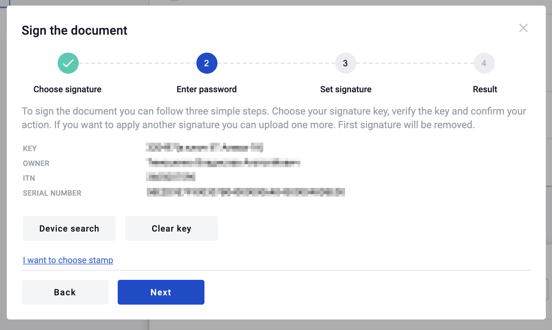 If the password is valid and the key is valid, you will see signature details and the next step.