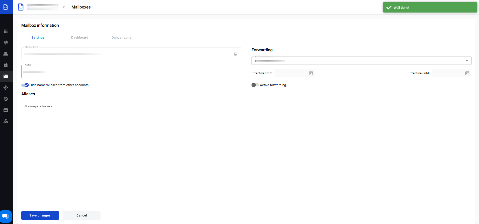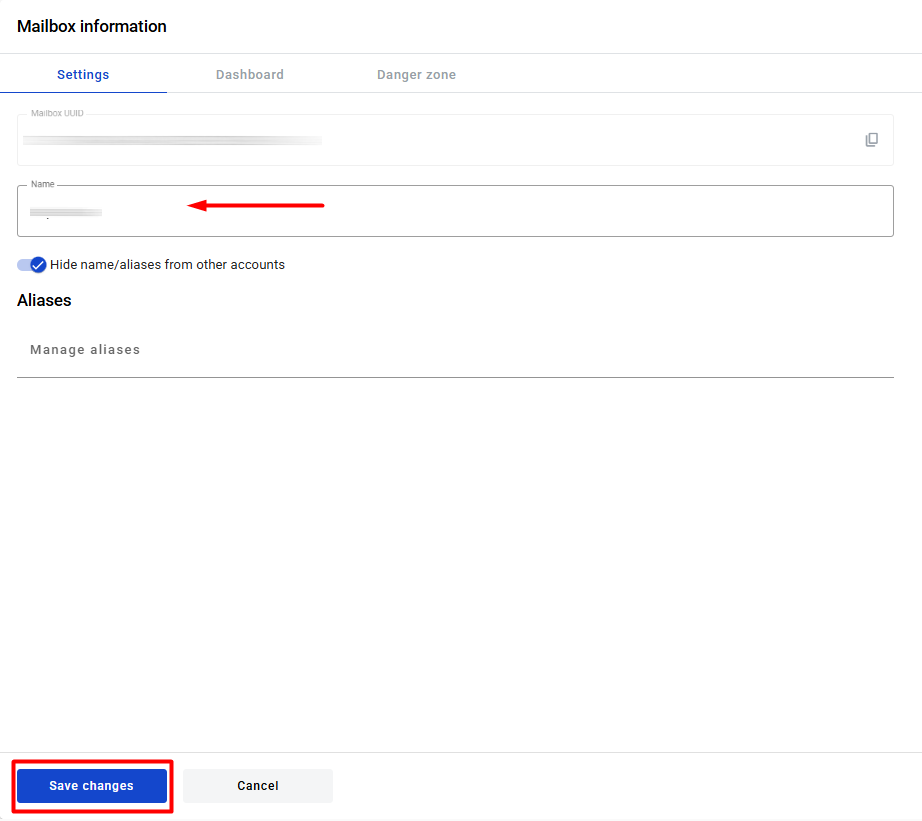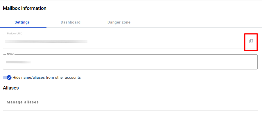 Use this section to copy the mailbox UUID, rename the mailbox, and manage aliases.
