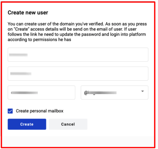 Fill in the required fields in the user creation form, such as: First name, Last name, the first part of the email address, and select the domain part. You can also choose whether or not to create a personal mailbox for this user