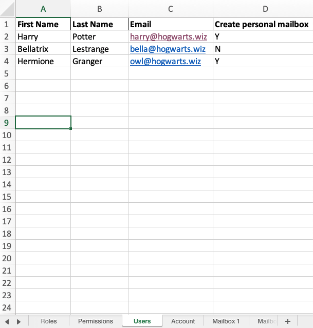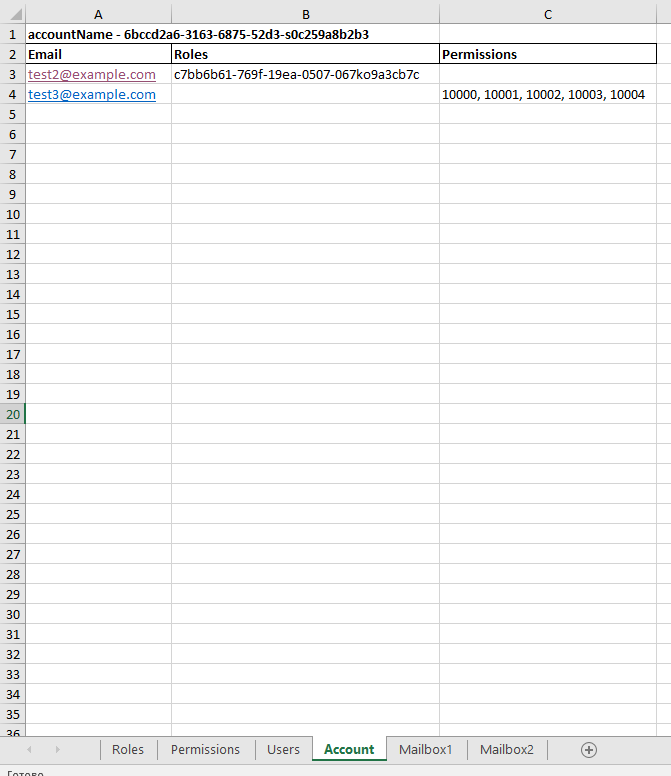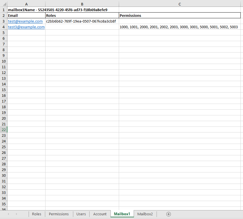 The fifth and next sheets are Mailboxes. At the top of each sheet is the mailbox ID. You can configure access to the mailbox using roles or permissions. If you add an incorrect email address to the table, it will not be added to the platform.
