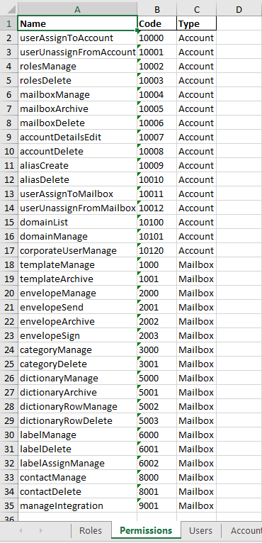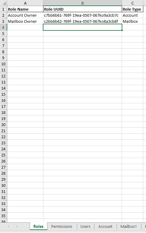 The first sheet is Roles. This sheet shows all the roles available for a particular account. If you want to clarify what exactly a particular role does, you can get this information using the user interface or API. You can also use the information about roles on the Account and Mailbox pages if you wish (we'll describe this below)